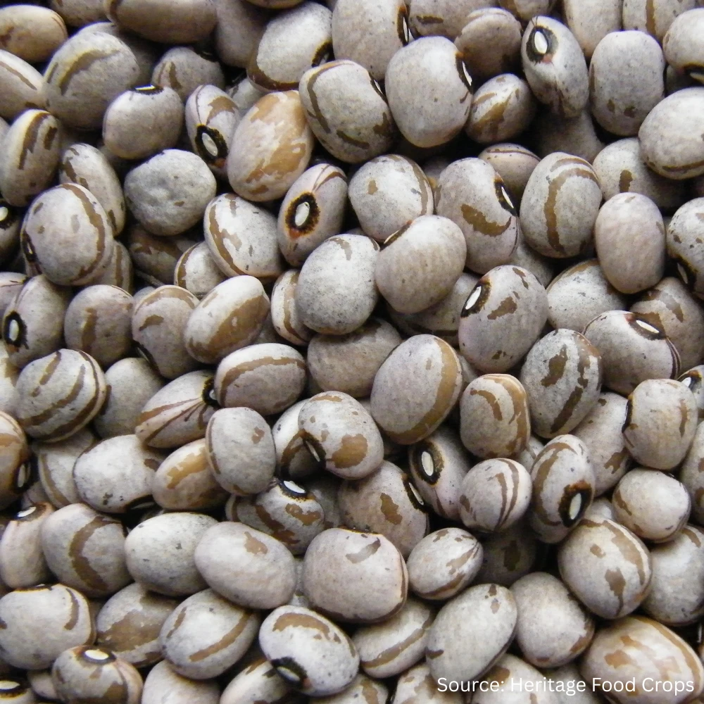 High yielding climbing bean producing seeds with dark stripes over a speckled light background. A diversely coloured bean with stripes ranging from brown and tan to blue-grey and black. An absolutely delicious dry bean. With the addition of onions and garlic, it can make a wonderful meal. Can be used as Pot beans, Chillis, salads, or in stews. From the Tarahumara region of Mexico.
