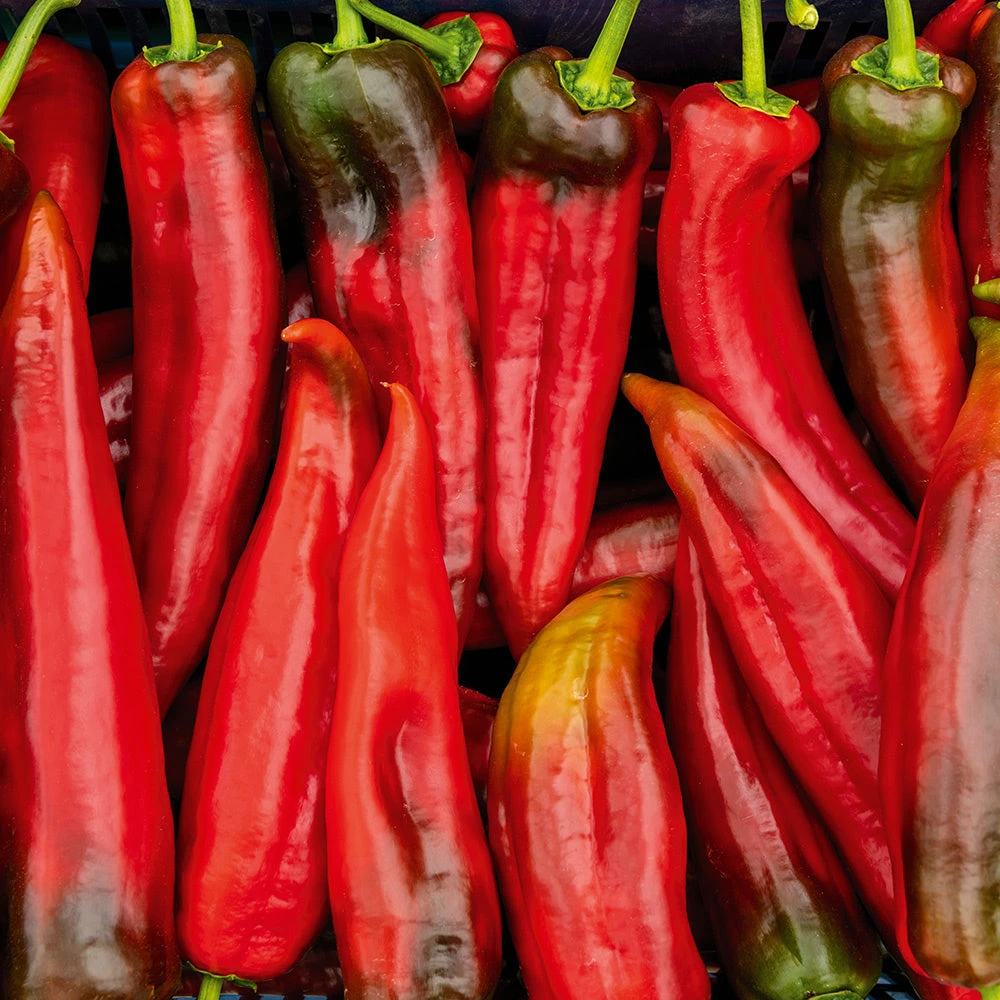 Italian heirloom sweet capsicum known as a Corno di Toro (Bull’s Horn). Colourful 20 to 25cm long, deep-red fruit, sometimes curved like a bull’s horn. Slightly hot to taste, delicious raw in salads but are more often sautéed, grilled or roasted. Prolific yields of fruit on tall plants.