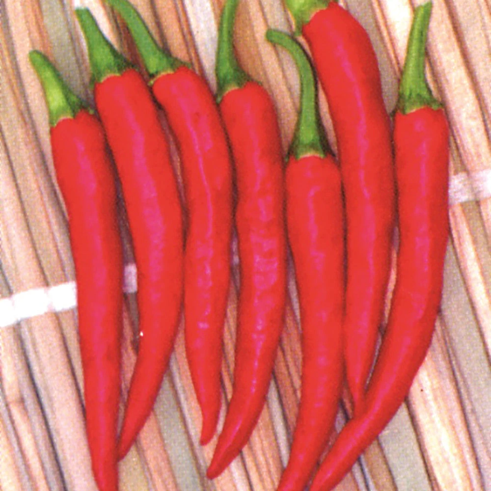 A hybrid, red cayenne chilli, ideal for general purpose cooking fresh or for drying with a Scoville rating of 30,000-50,000. Prolific yields of slender, 13cm long fruit that can be harvested and used either green or red. A vigorous plant of medium-tall height and with good disease resistance.