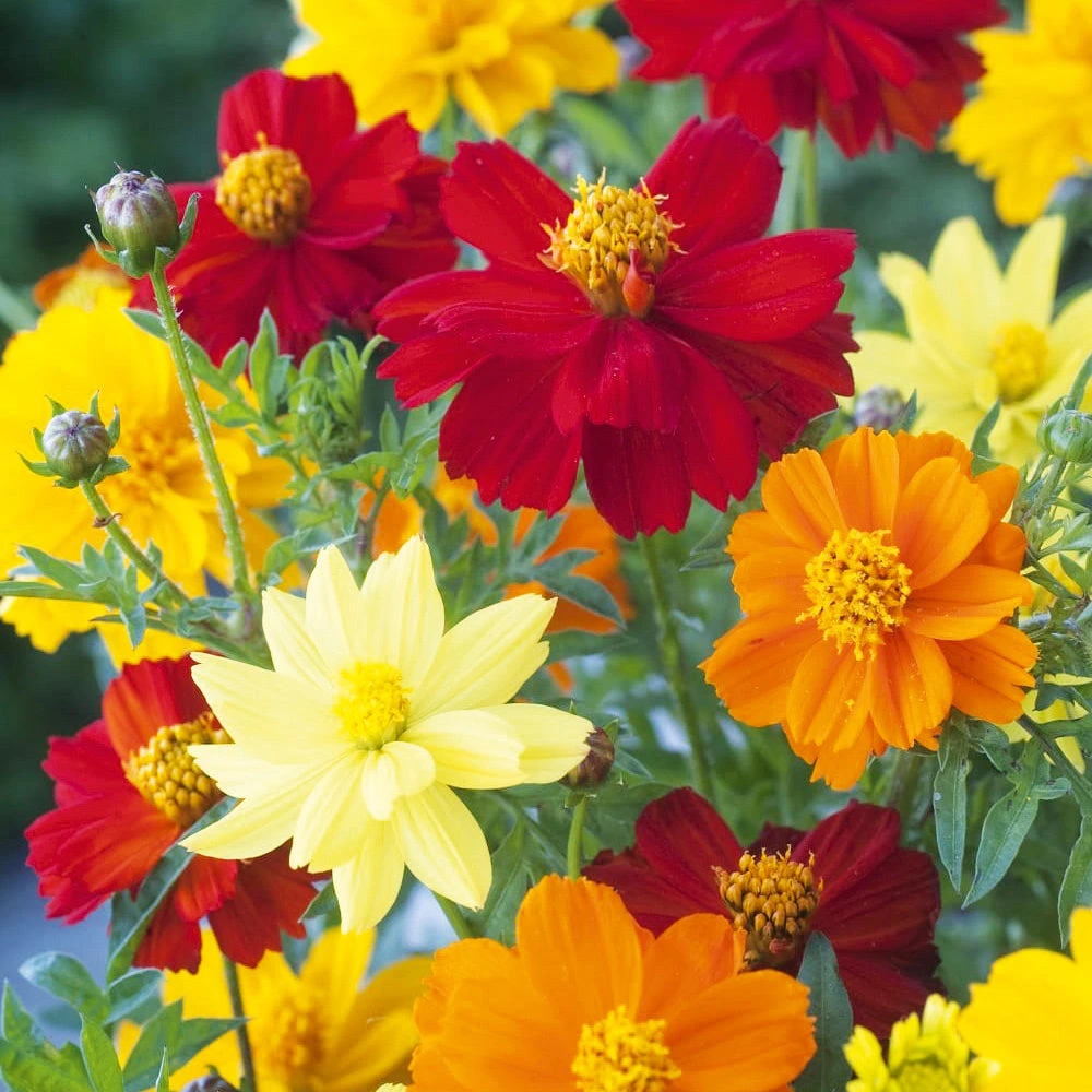 One of the most colourful blends of dwarf cosmos available in a bright array of gold, lemon, orange and red, double-petalled flowers. Stunning en masse in borders or sow in containers to brighten your patio and outdoor areas.