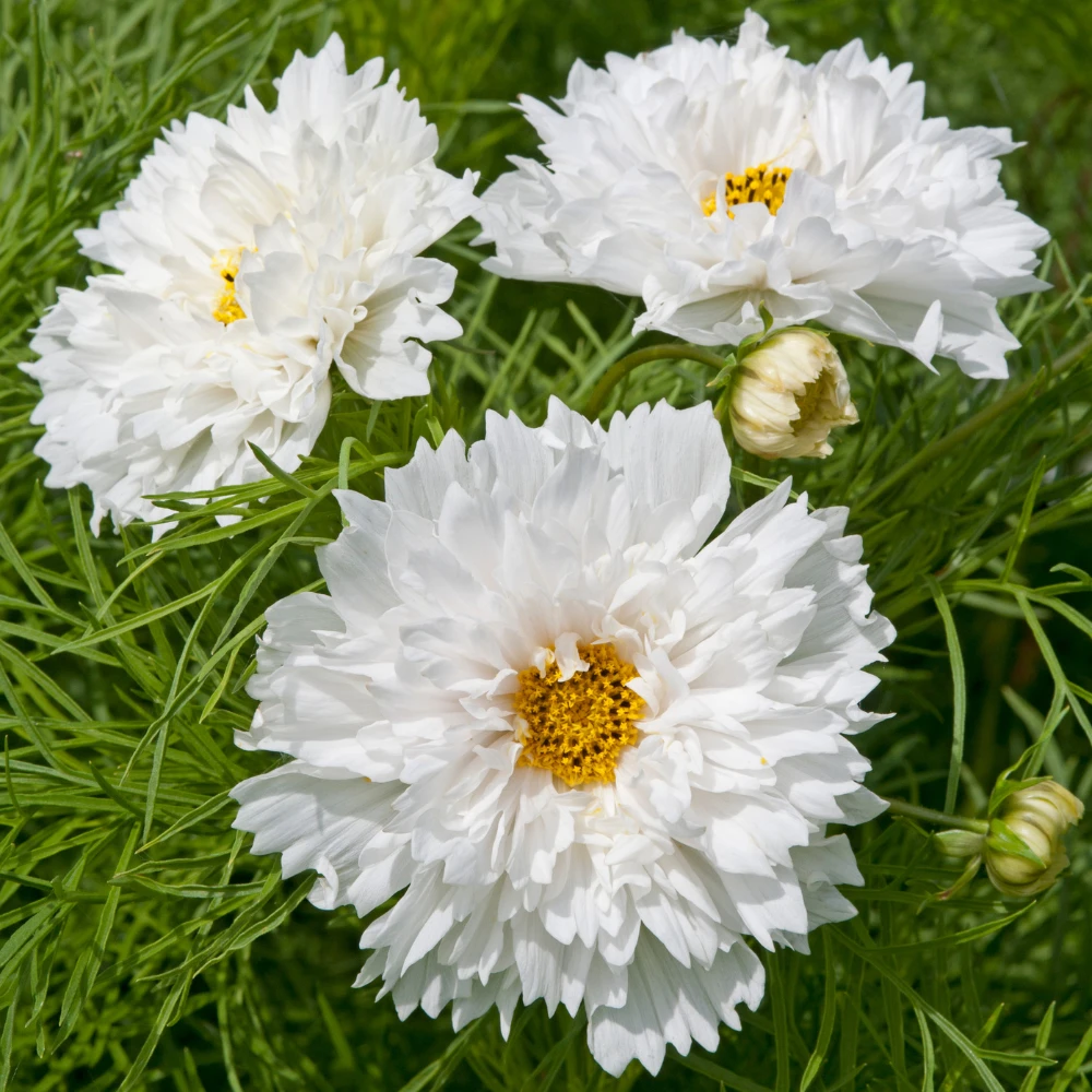 Large, semi-double to double flowers in pure white. This floriferous variety produces masses of gorgeous flowers on mid-green fern-like foliage. A fabulous inclusion in your picking garden and will flower over a long period of time if regularly picked or deadheaded. Great for attracting pollinators to your garden.