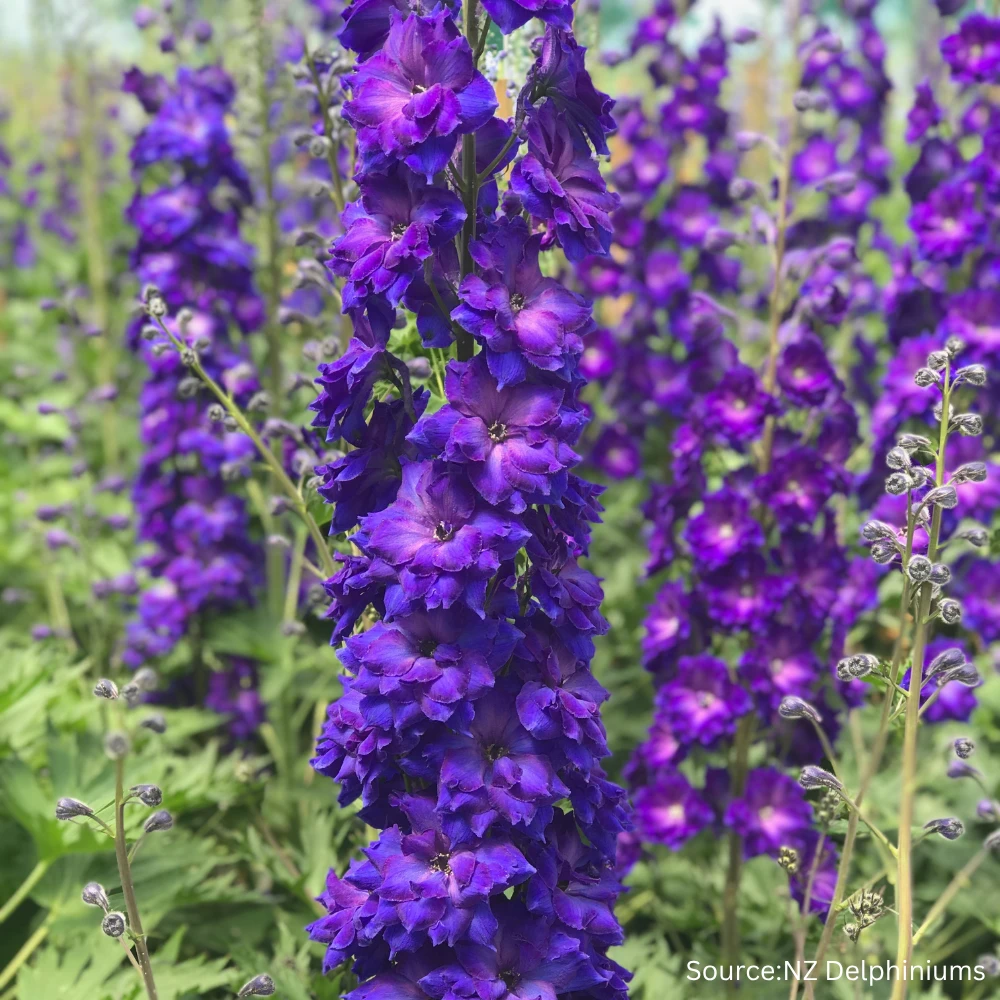 Gorgeous ruffled, double blossoms in dark-blue, purple. Strong stems for cut flowers and height in the border. Bred by New Zealand Delphiniums, so well adapted to NZ growing conditions but with the elegance and quality required for global cut flower and landscaping markets.