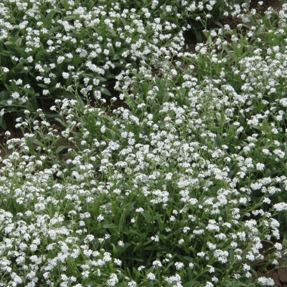 Delicate white forget-me-nots, ideal for shady gardens and woodland settings. Although biennial, can be grown as an annual if sown indoors 8-10 weeks before the last frost. Sown outdoors in autumn, they will bloom in spring. Profuse bloomers that readily self-sow.
