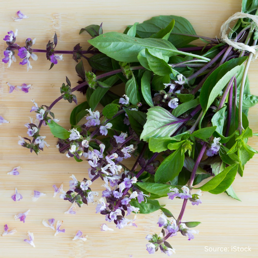 Cinnamon basil features glossy, deep green leaves and delicate purple stems with a warm, spicy fragrance. It pairs beautifully with bold blooms and adds an unexpected layer of scent. Bergamot lemon offers citrusy, uplifting notes and soft green foliage that complement both rustic and elegant arrangements.