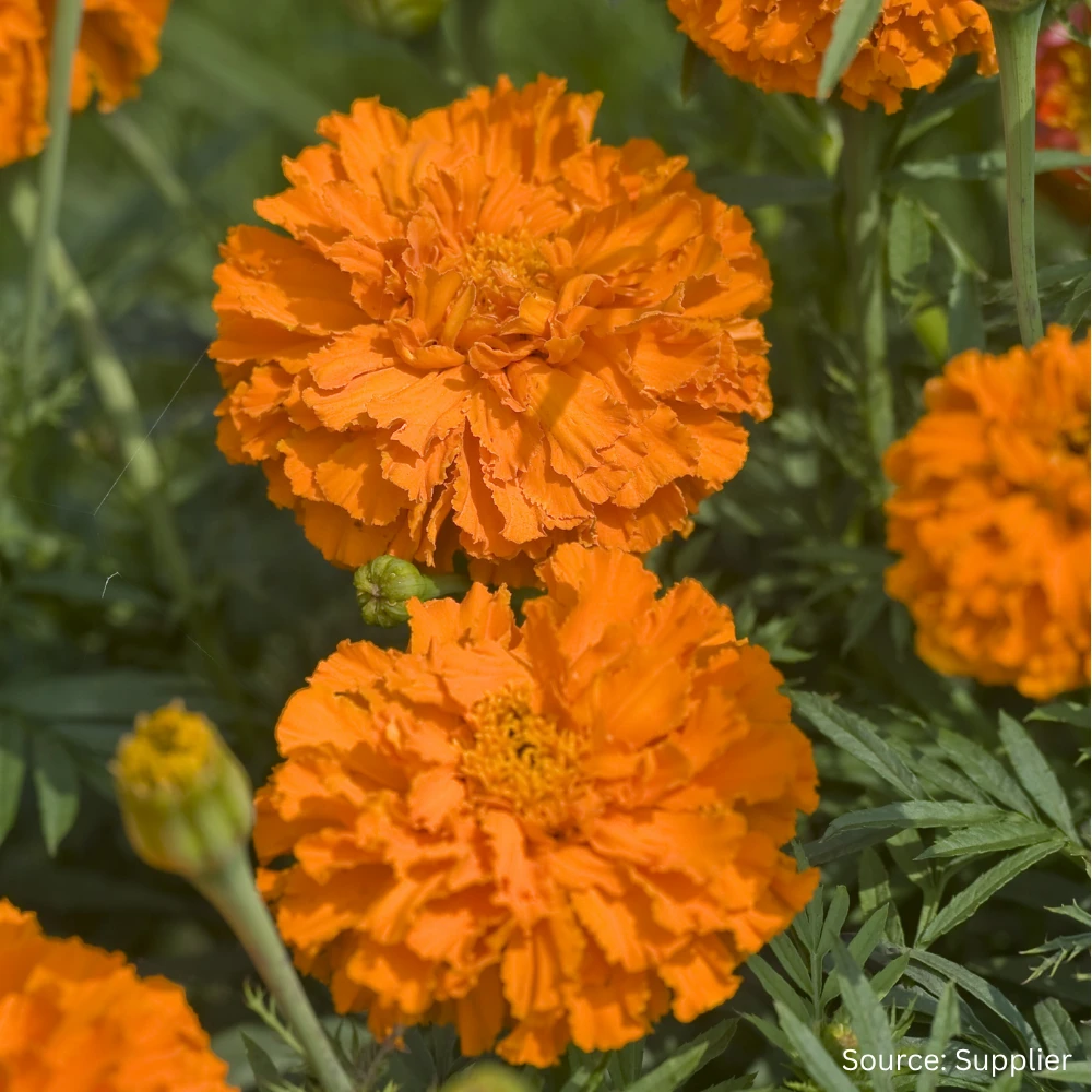Transplant seedlings when they have 2–3 true leaves, spacing them 30–40 cm apart in full sun. Marigolds prefer well-drained soil and are drought-tolerant once established. Regular deadheading encourages more blooms.