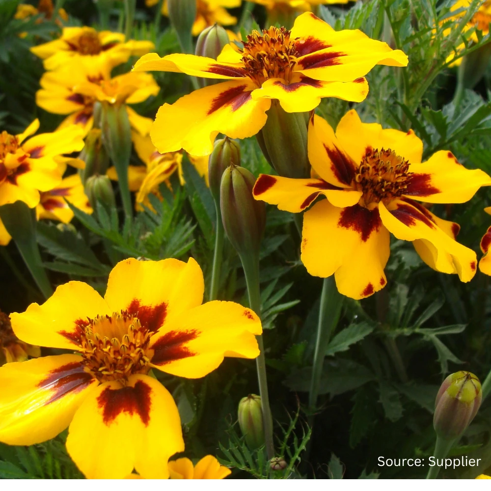 Tagetes patula ‘Naughty Marietta’ is a charming and compact French marigold, much loved for its bright golden-yellow blooms marked with deep mahogany-red blotches. This cheerful bicolour effect makes it a standout in borders, containers and edging, where its vibrant hues bring warmth and contrast to summer gardens. The finely divided foliage adds a soft, ferny texture, and the plant’s neat, bushy habit—typically growing to 30–40 cm tall—makes it ideal for small spaces and mass plantings.