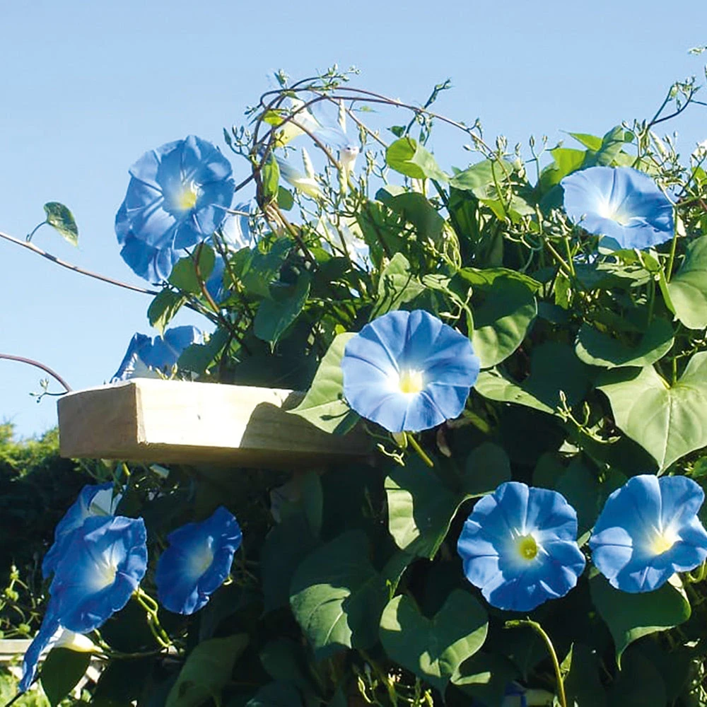 Trumpet-shaped flowers of sky-blue that unfurl in the morning sun, hence the name. These fast-growing vines can reach impressive heights, creating a picturesque backdrop and burst of colour to gardens, fences and trellises.