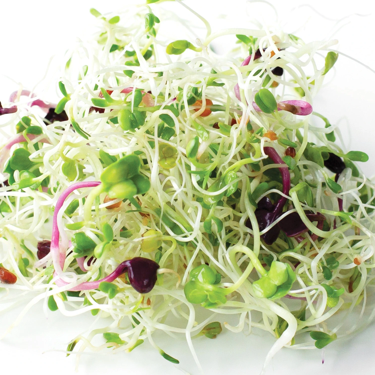 A highly nutritious blend of alfalfa, radish (various varieites), red clover and broccoli. Our most eye appealing mix with different colours and forms. Low in calories, high in fibre and protein, rich in vitamins, minerals, amino acids and antioxidants, sprouts are a true superfood. Sprouts are easily digested and sprouting increases the content and bioavailability of vitamins and minerals. The sources of antioxidants in this blend may have benefits for heart health, reduce cholesterol absorption and help to regulate blood sugars.