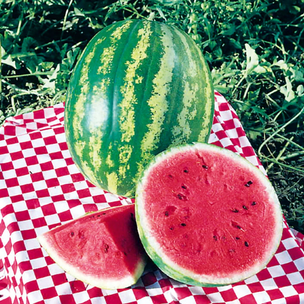 A popular watermelon with sweet, firm, bright-red flesh and great flavour. The fruit is round-oval in shape with a pale-green background and dark-green stripe. A vigorous vine producing numerous fruit, at maturity fruit are 7-11kg in size.