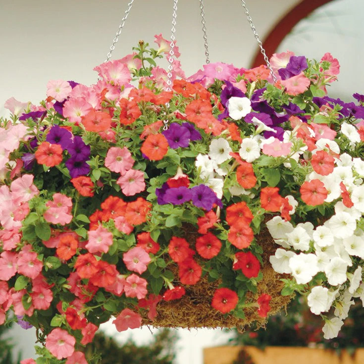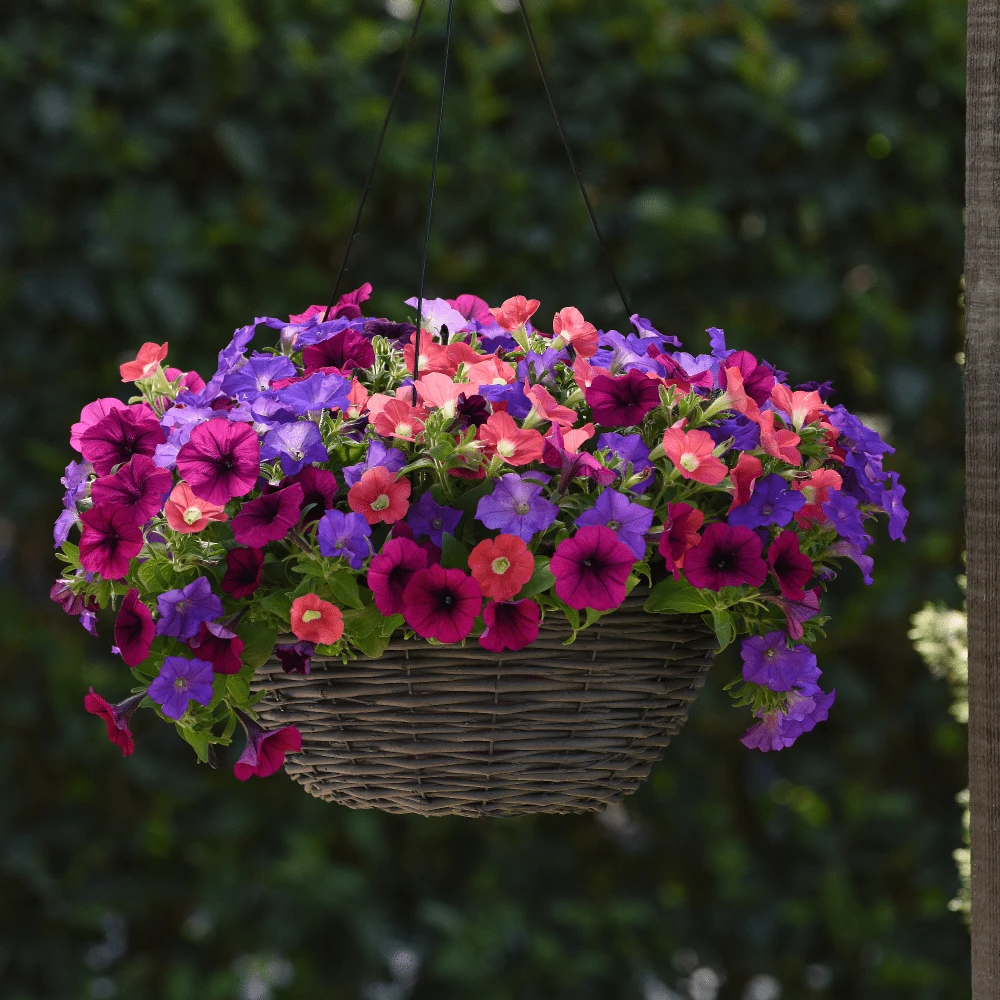A trailing petunia in vibrant colours with trumpet-shaped blooms that blanket the plants. Ideal for hanging baskets or as a showy ground cover, keeping them regularly fed and watered will ensure ongoing flowering. Popular for adding colour and beauty to outdoor spaces.