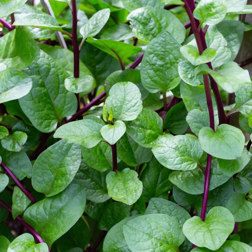 A heat-loving vine with crimson stems and glossy, heart-shaped leaves with a mild flavour. Seeds are best started indoors 6-8 weeks before planting outdoors. Cultivate in well-drained soil with ample sunlight and support for climbing, attractive in pots with a frame. Highly sensitive to frost.