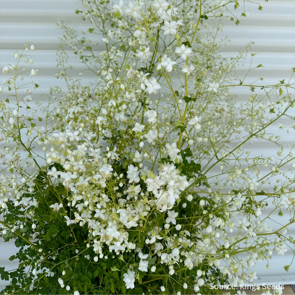 As a cut flower, Thalictrum ‘White’ offers both elegance and longevity. The wiry stems and dainty blooms add lightness and movement to floral arrangements, making it a popular filler for soft, romantic bouquets.