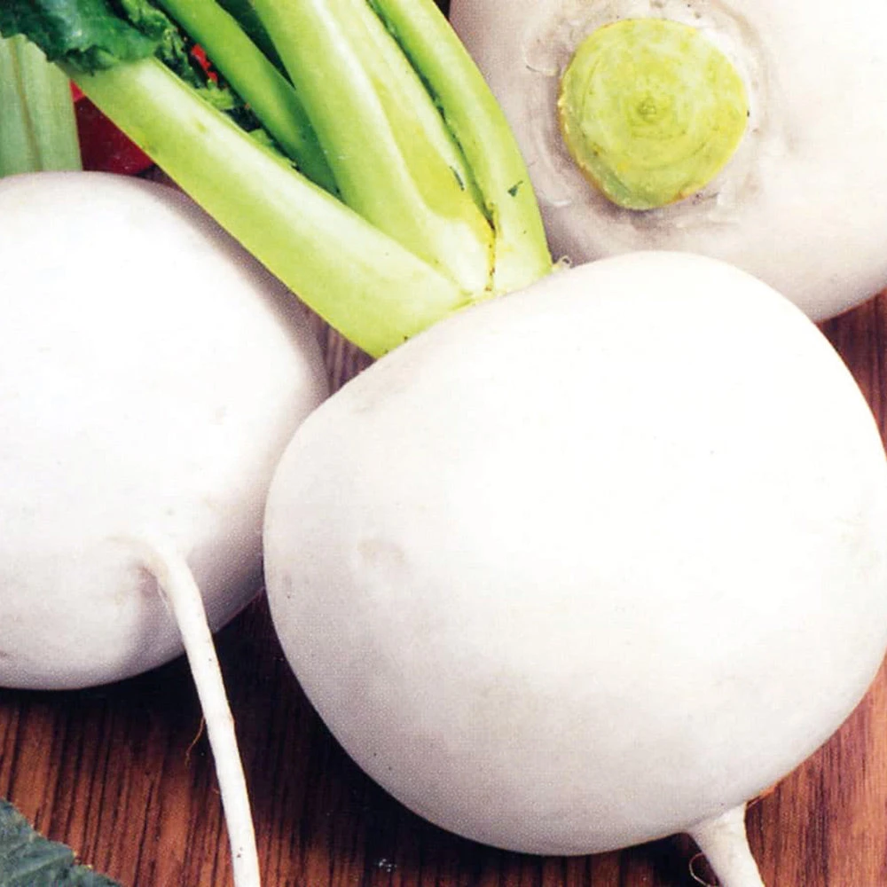 Easy to grow, early globe turnip with white skin and flesh. Sweet flavoured and juicy, high in fibre and vitamin C and also has edible green tops. Sow from late spring until late summer and best harvested before it gets too large. Sow into rich well manured soil and thin out leaving the best plants.
